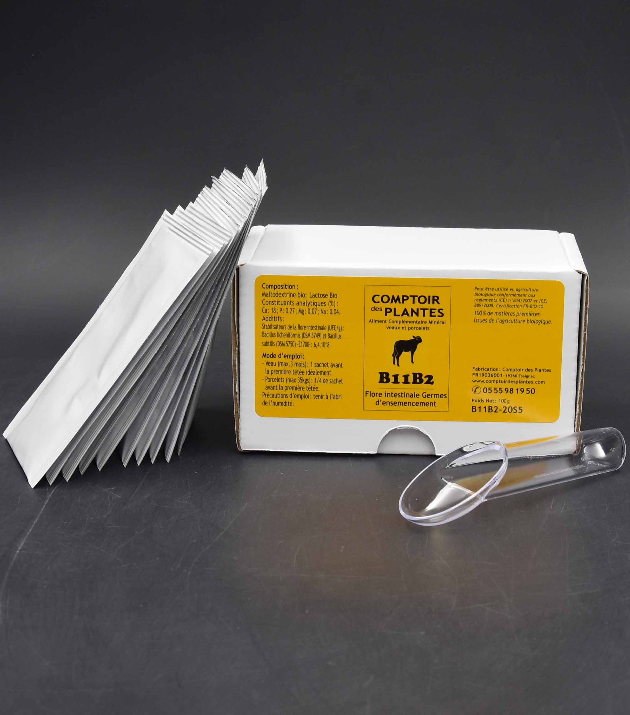 | B11B2 : Germes d'ensemencement cascade l'implantation d'une flore intestinale favorable. Il contient des germes stabilisateurs de la flore intestinale que l'on cherche à implanter le plus tôt possible, avant que les germes pathogènes présents dans 50'environnement et sur la mère ne prennent la place. ¼ de sachet par agneau ou par chevreau |